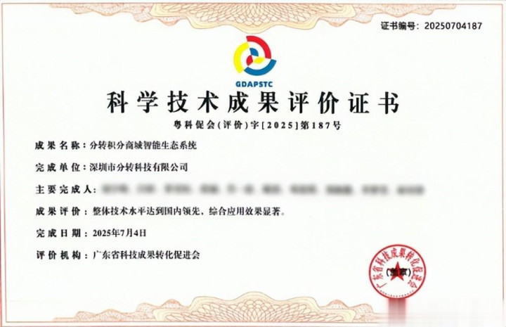 系统突破:创新边界再拓展 2025年7月,分转科技凭借“分转积分商城智能生态系统”荣获科学技术成果评价证书,标志着其在积分系统创新上的重大突破。智库团队在系统研发中,引入大数据与人工智能深度融合技术,构建了全球首个2B2C积分闭环生态,实现了“消费→兑换→采购→再消费”全链路的生态系统,对促进商业数字化、智能化发展具有重要意义。 这一系统不仅让分转商城的积分兑换更智能、更具生态价值,也为整个数码电商行业的积分系统创新,提供了可借鉴的思路。截至目前,分转科技用户注册量突破500万+,庞大的用户基础,既是对其创新成果的市场认可,也反映出智库团队通过持续创新,不断拓展品牌影响力的成效。